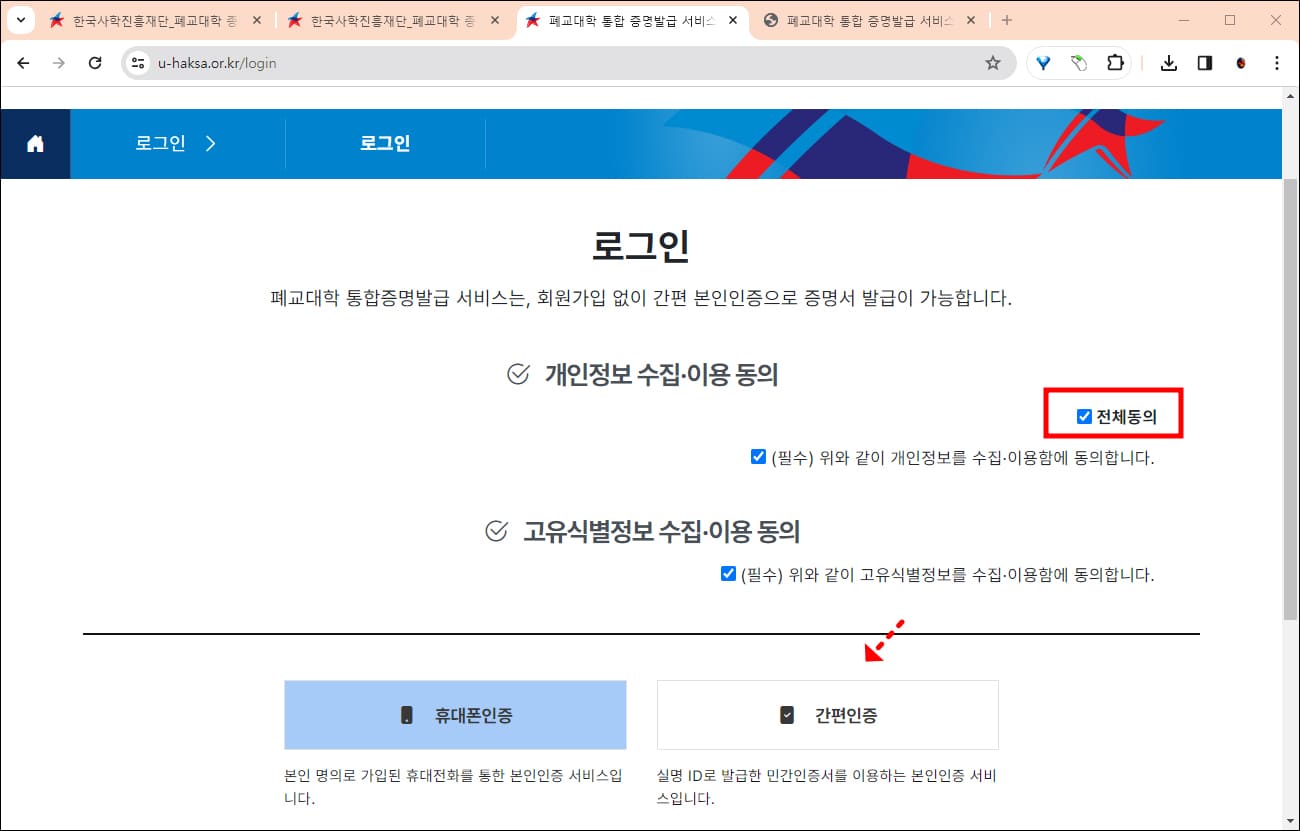 회원가입 없이 약관에 전체 동의하고 휴대폰 인증/간편인증(네이버/카카오)만 진행하면 됩니다.