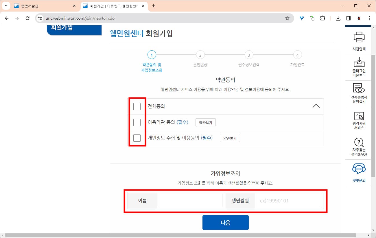 웹민원센터 회원가입 메뉴를 찾기 어렵다면 간편인증을 눌러서 진행하면 됩니다. 아직 회원가입이 안되었다는 메시지가 뜨면서 바로 해당 메뉴로 접속할 수 있습니다. 약관에 동의하고 이름, 생년월일을 입력한 후 본인인증, 필수정보입력을 하면 됩니다.