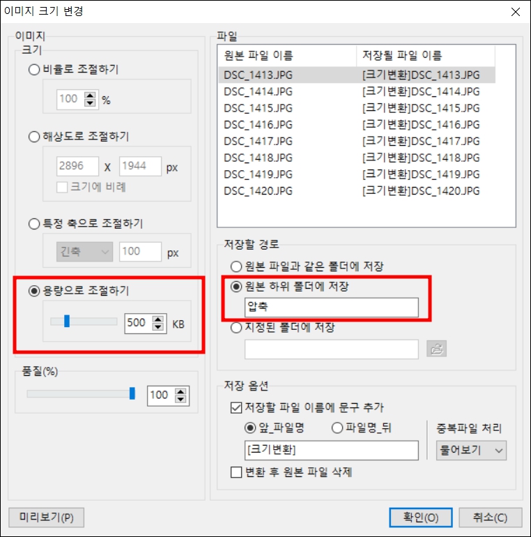 용량으로 조절하기를 선택하고 원본을 그대로 둔 후 원본 하위 폴더에 저장해 보겠습니다. 저장 옵션에 파일명을 변경해 주기 때문에 원본 파일은 그대로 있도록 설정했습니다.