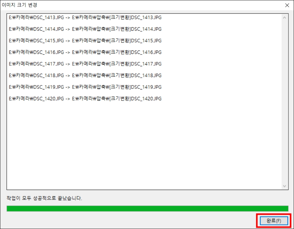 이미지 크기 변경 창이 뜨면서 하나씩 리스트가 나옵니다. 8개의 파일 이미지 용량 줄이기 시간은 1분도 걸리지 않았습니다.