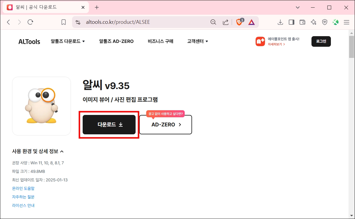 현재 지원되는 알씨는 v9.35 버전입니다. 광고가 나오지 않는 AD-Zero는 유료 프로그램이므로 검은색 다운로드 버튼을 선택해야 무료로 사용할 수 있습니다.