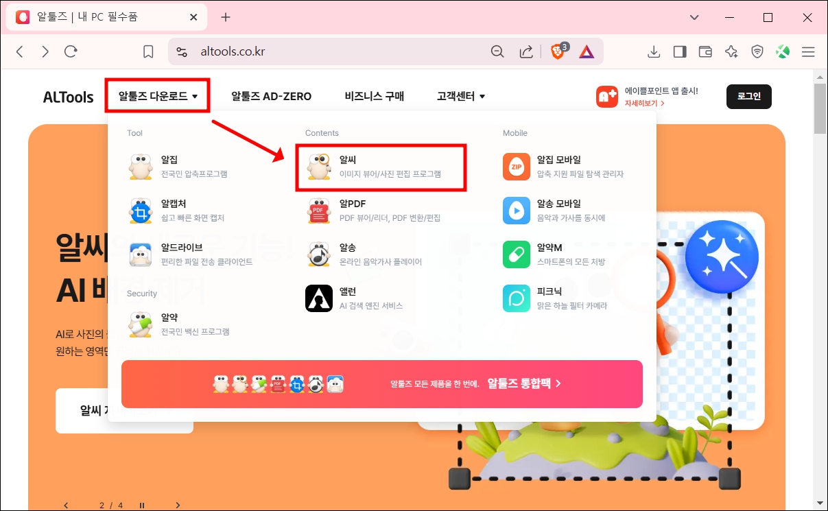홈페이지 첫 화면에서 상단에 있는 알툴즈 다운로드를 선택합니다. 알툴즈 프로그램들이 표시되면 알씨를 선택합니다.