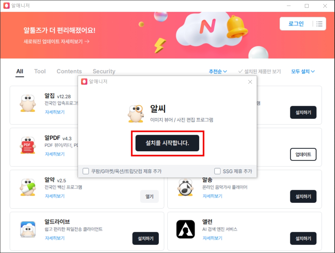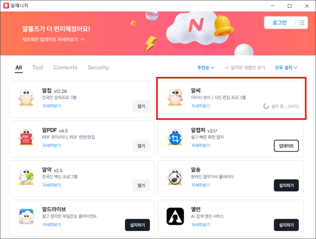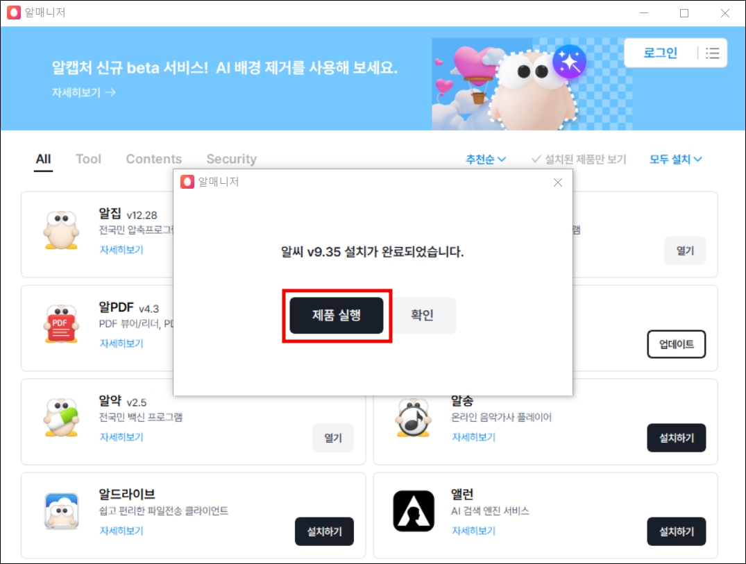 기존에 알툴즈 프로그램을 사용하고 있다면 알매니저 프로그램이 깔려 있어서 바로 아래와 같은 화면이 나옵니다. 알툴즈 프로그램을 한 번도 사용한 적이 없다면 알매니저 설치를 먼저 한 다음 진행해야 합니다.