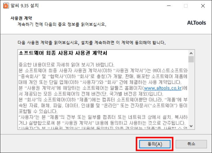 알씨 설치 화면이 나오면 소프트웨어 최종 사용자 사용권 계약서가 표시됩니다. 동의 버튼을 눌러 주세요.