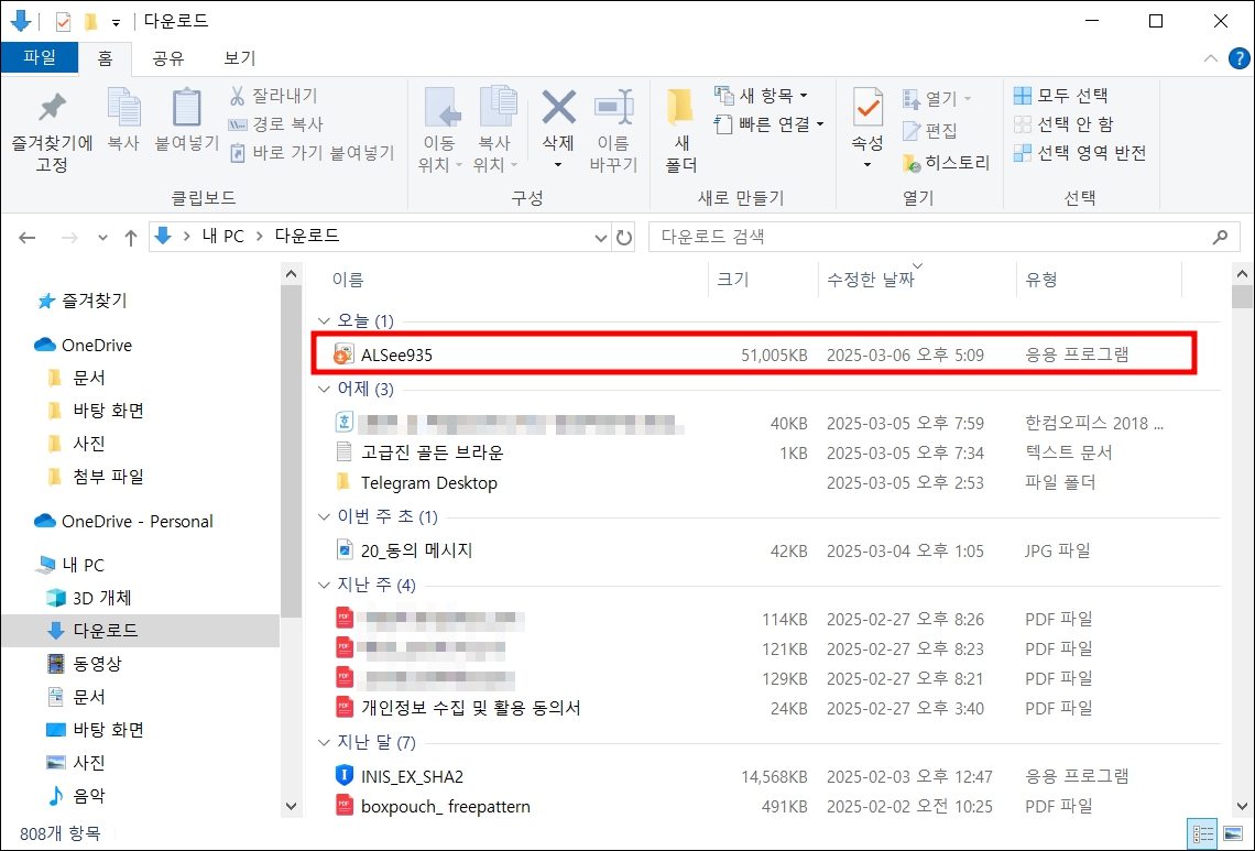 컴퓨터의 다운로드 폴더에서 알씨 설치 프로그램을 클릭합니다. 설치 프로그램 용량은 51MB입니다.