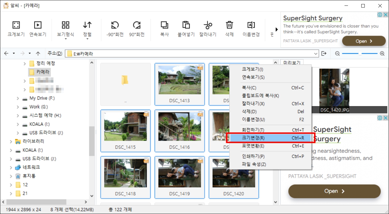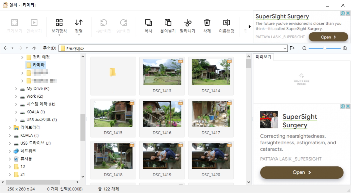 알씨가 실행되면 사진이 있는 폴더로 이동합니다. 프로그램 왼쪽은 탐색기 모양이며 오른쪽에 썸네일로 이미지가 표시됩니다. 무료 프로그램을 사용하면 오른쪽에 광고가 표시됩니다.