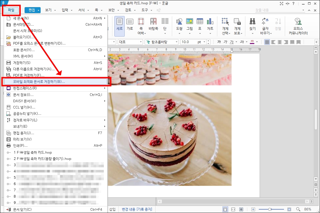 위에서 사용했던 파일로 똑같이 작업해 보겠습니다. 파일 메뉴에서 모바일 최적화 문서로 저장하기를 선택합니다.