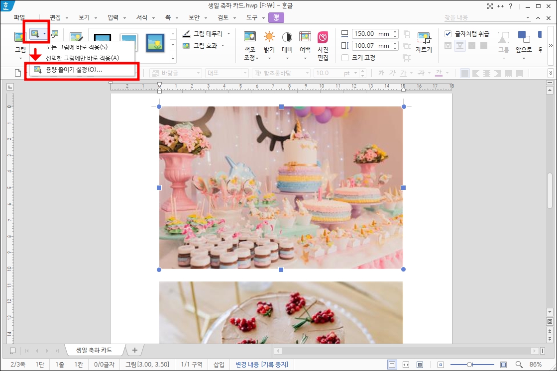 또한 한글 파일에 들어가는 이미지 자체를 미리 편집해서 크기를 줄이는 것도 추천하는 방법입니다.