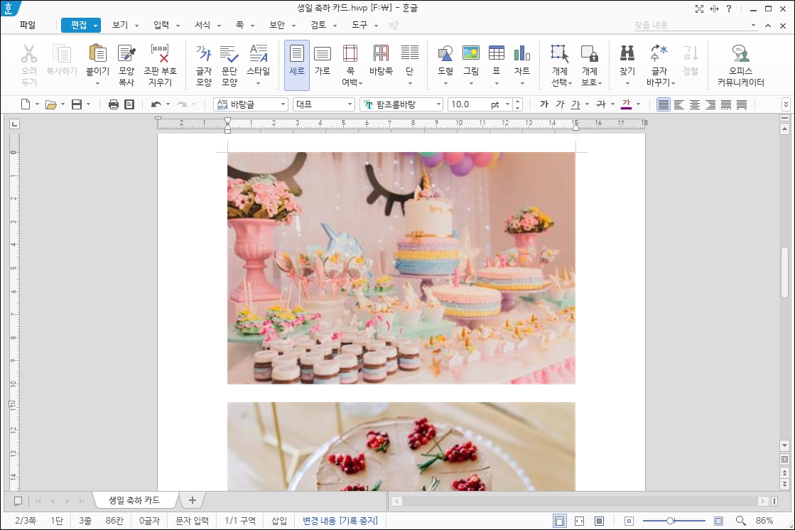 용량 줄이기 작업을 할 파일을 엽니다. 이해를 돕기 위해 사진이 여러 장 들어간 파일을 만들어 보았습니다. 파일 상단에 문서 편집 메뉴가 있는 것을 볼 수 있습니다.