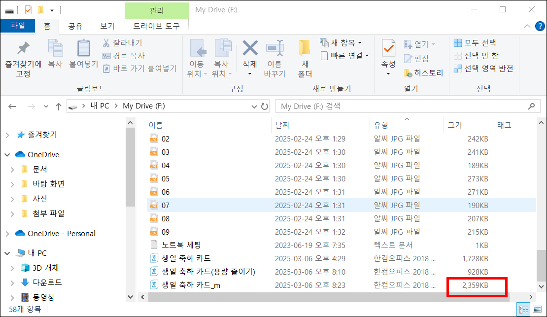 모든 옵션을 선택하고 72dpi로 설정한 상태에서 파일을 저장해 보니 약 50% 정도 한글 파일 용량 줄이기가 된 것을 확인할 수 있습니다. 이 기능은 페이지 분량이 많을 때 하나씩 수정하지 않아도 된다는 장점이 있습니다.