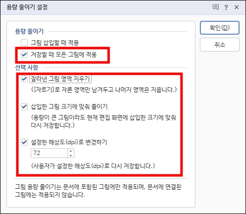 용량 줄이기 설정 세부 사항입니다. 그림을 처음에 넣을 때부터 적용할 수도 있고 저장할 때 모든 그림에 적용할 수도 있습니다. 물론 둘 다 선택 가능합니다.