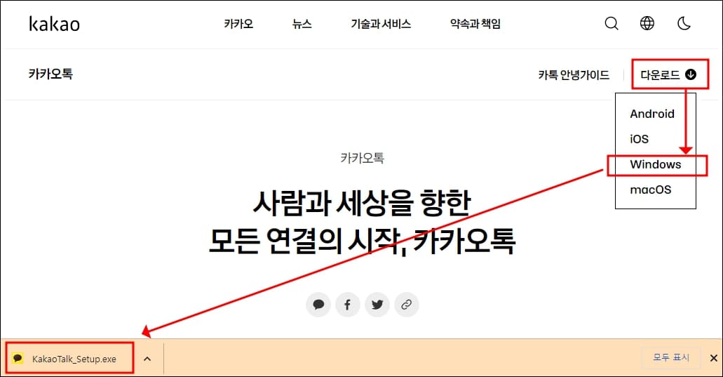 카카오 사이트에 들어가면 첫 페이지 우측 상단에 다운로드 메뉴가 있습니다. 저희는 카톡 PC 버전 다운로드를 진행할 예정이므로 Windows를 선택합니다. 만약 맥북을 사용한다면 macOS를 선택하면 됩니다.