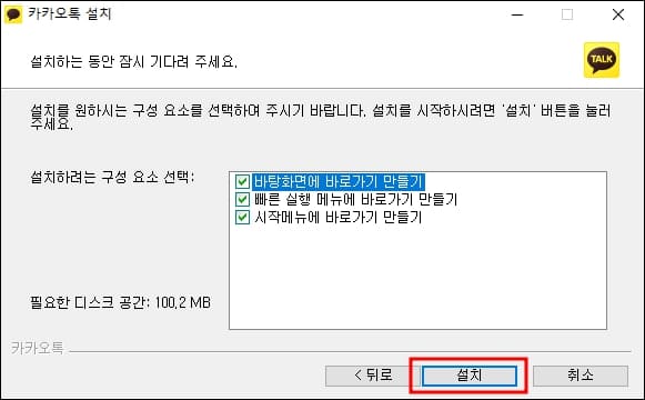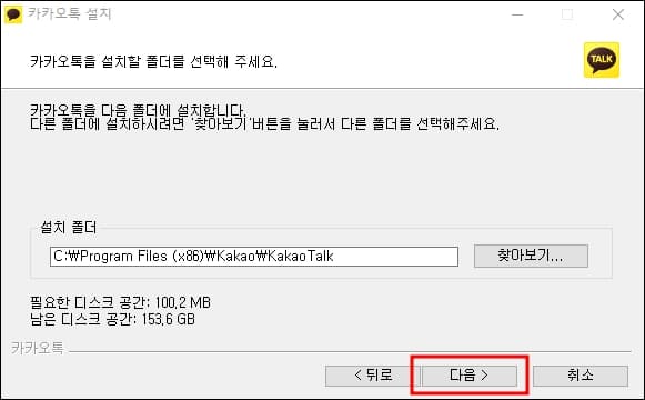 카톡을 설치할 위치가 나옵니다. 이 부분은 건드리지 않고 진행하는 것이 좋습니다.