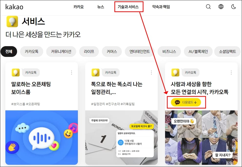 만약 첫 페이지에서 다운로드 메뉴를 찾을 수 없다면 '기술과 서비스' 메뉴로 들어가면 됩니다. 서비스 중 카카오톡의 다운로드를 선택하면 마찬가지로 PC버전을 선택할 수 있습니다.
