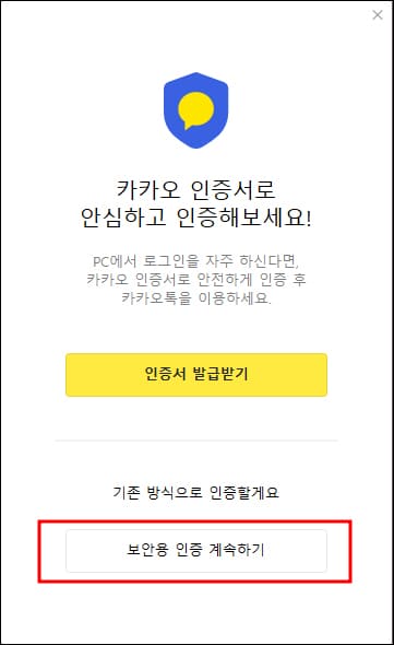 처음 카톡 PC버전으로 로그인을 시도하면 인증 관련 화면이 나옵니다. 카카오 인증서로 인증해도 되는데 저는 가장 보편적인 '보안용 인증 계속하기'를 선택했습니다.