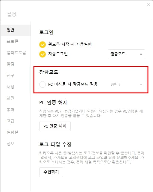 스마트폰과 달리 PC에서는 자리를 비웠을 때 다른 누군가가 메시지를 몰래 볼 수도 있어서 가급적이면 잠금모드를 적용하는 것을 추천합니다. 1분, 2분, 3분, 5분, 10분으로 정할 수 있습니다.
