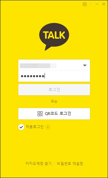 설치한 카톡 PC버전이 실행되면 스마트폰 앱과 유사한 화면이 나옵니다. 카톡 아이디와 비밀번호를 입력하여 로그인을 실행합니다. 보안을 위해 QR코드 로그인을 할 수도 있지만 QR코드를 매번 체크하기는 조금 불편한 면이 있습니다.