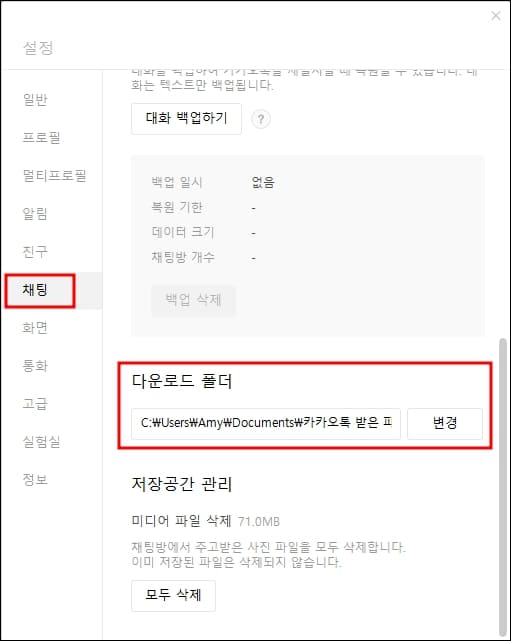 또한 다운로드된 사진이나 파일, 동영상의 위치를 확인하거나 변경하는 것도 채팅 옵션 안에 있습니다.