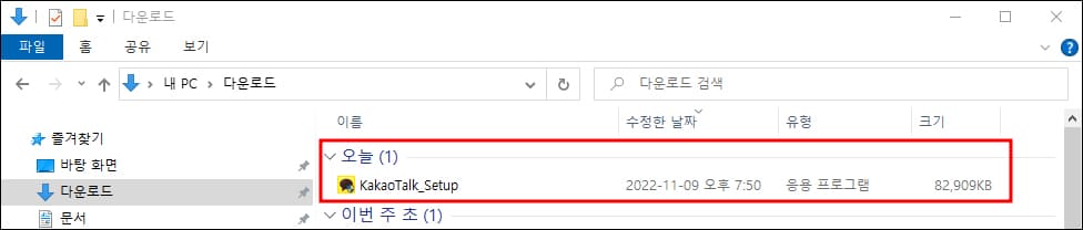 다운로드한 설치 파일은 KakaoTalk_Setup 파일입니다. 파일 용량은 약 82MB이며 필요한 디스크 공간은 100MB 정도 되니 설치 전에 컴퓨터의 남은 용량을 미리 확인하시는 것이 좋습니다.