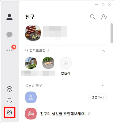 이제 모바일 카톡과 같은 화면을 볼 수 있습니다. 카톡 PC버전을 편리하게 사용하려면 왼쪽 하단에 있는 톱니바퀴 모양을 선택합니다. 거기에서 '설정' 메뉴를 선택하면 됩니다.