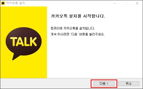카톡 PC버전 다운로드 후 설치 화면은 아래와 같습니다. 다음 버튼을 선택합니다.