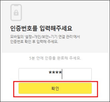 스마트폰의 카카오톡에 인증번호가 오면 그 숫자를 입력한 후 확인 버튼을 누르면 됩니다. 혹시 인증번호를 찾을 수 없다면 휴대폰 카톡 메뉴의 '설정' → '개인/보안' → '기기 연결 관리'에 있는 '보안 인증번호 확인' 메뉴를 이용하면 됩니다.