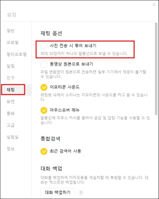 설정에서 채팅 옵션을 변경할 수 있습니다. 저는 사진을 여러 개씩 선택해서 보내는 경우가 많은데, '사진 전송 시 묶어 보내기'를 해 놓으면 사진을 30개까지 묶어서 보낼 수 있어서 편리합니다.