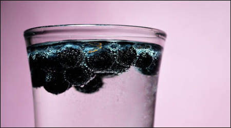 ③ 컵에 갈아준 블루베리를 넣고 얼음 적당량과 탄산수 1/2컵을 넣어 섞어 줍니다.