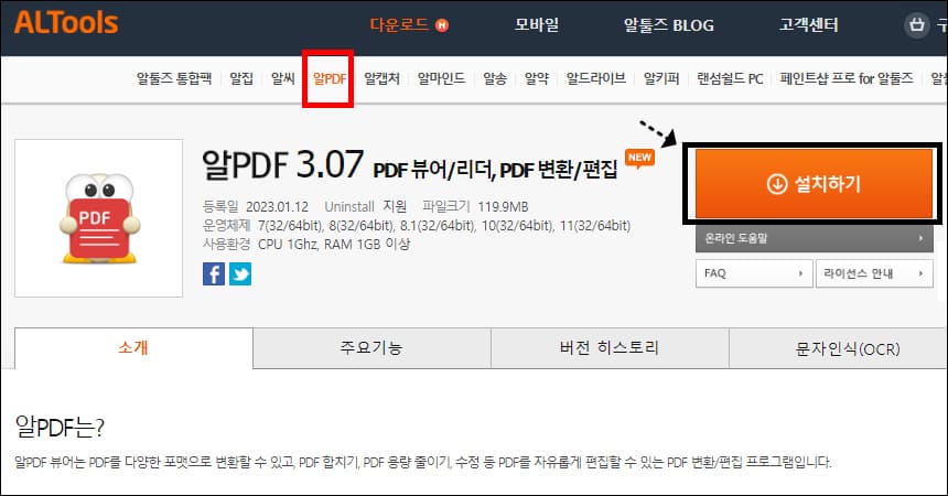 알툴즈 홈페이지에 있는 알PDF 메뉴를 확인하면 오른쪽에 설치하기 버튼이 있습니다.