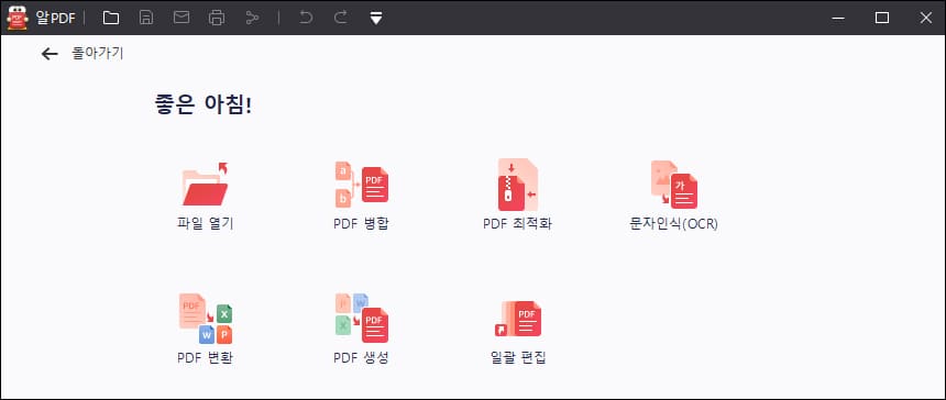 이제 알PDF를 실행해 보겠습니다. 파일 열기, PDF 병합, PDF 최적화, 문자인식(OCR), PDF 변환, PDF 생성, 일괄 편집 메뉴가 뜹니다. PDF 편집 프로그램은 아래한글, 워드 프로그램처럼 신규 만들기 기능은 없습니다.