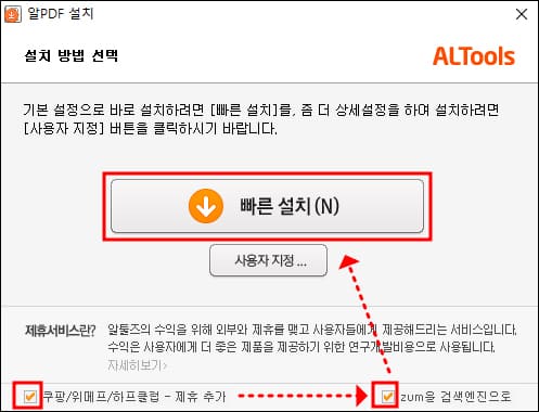 기본 설정으로 설치하는 분은 바른 설치를 선택하면 됩니다. 이때 하단에 2가지의 제휴 서비스가 기본적으로 선택되어 있으니 원하지 않는 분은 해제하고 진행하시면 됩니다.