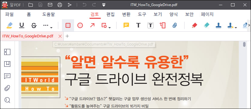 파일 열기를 통해 이미 만들어진 PDF 파일을 열어 보았습니다. 상단에 파일과 편집, 변환 프로그램 등이 위치한 것을 볼 수 있습니다. 메뉴들의 기능이 직관적으로 되어 있어서 사용이 크게 어렵지 않습니다.