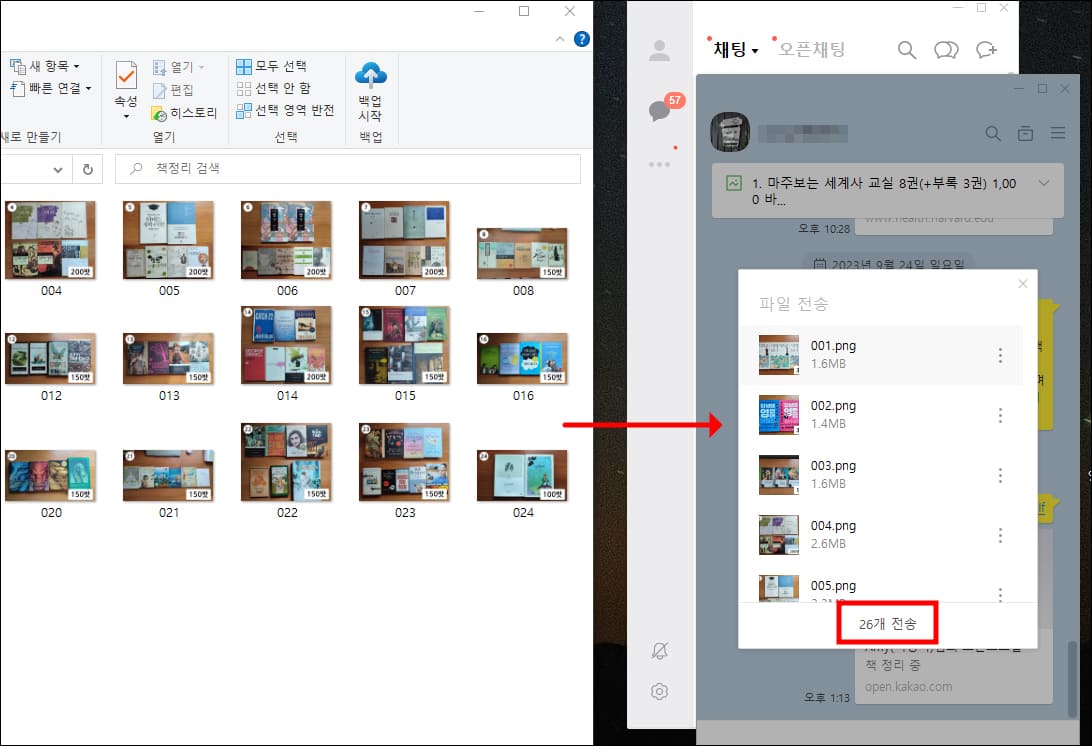아니면 탐색기에서 바로 파일을 드래그해서 채팅창으로 옮겨도 됩니다. 설정을 사진 묶어보내기로 했기 때문에 각자 따로 가지 않고 묶음 전송 화면이 뜹니다. 선택한 파일 개수가 맞으면 전송 버튼을 누릅니다.